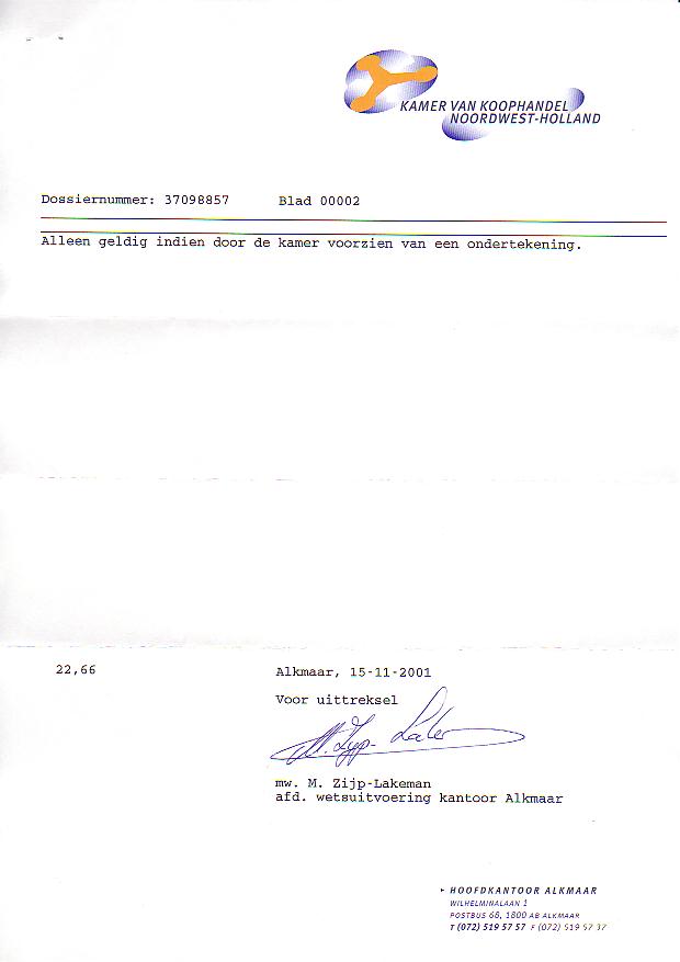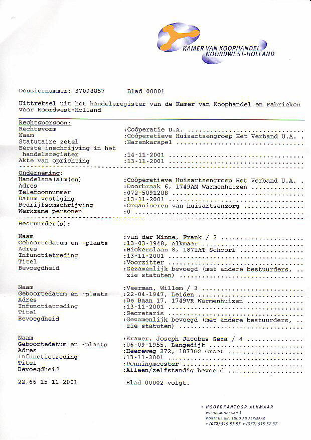 Op 14 november 2001 is 'Het Verband' ingeschreven bij de Kamer van Koophandel te Alkmaar